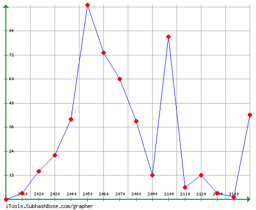 A roughly-bell-shaped curve, peaking around 2025 - with a