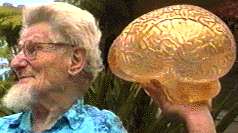 of John Lilly, next to a full-size model of the brain of a sperm whale: